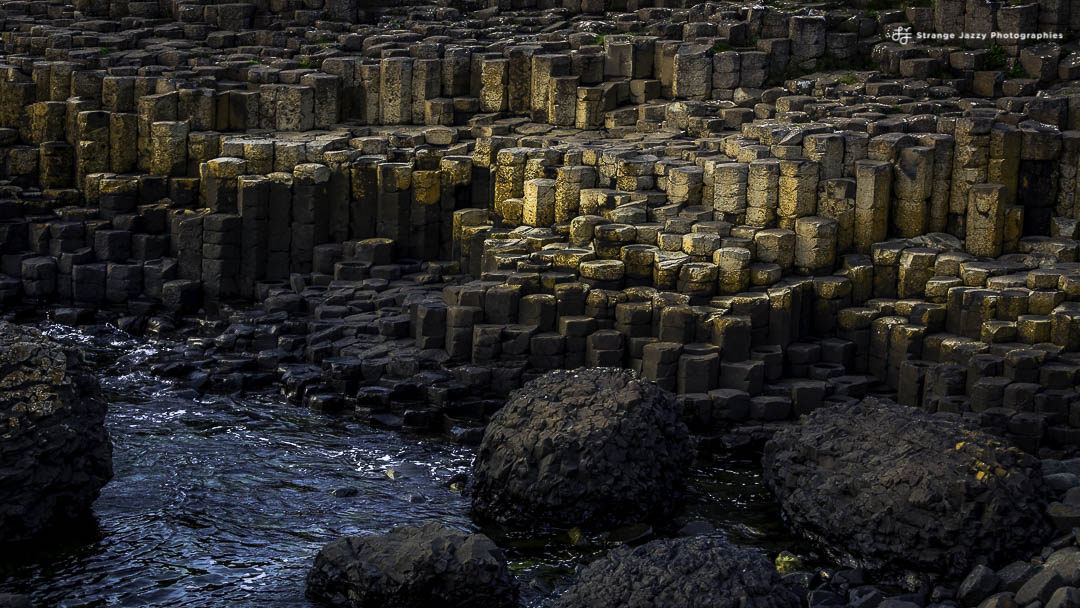 In situ l’impression d’immensité est saisissante, la première vision depuis la plage avec en fond les falaises c’est l’immensité . Plus nous nous rapprochons plus les colonnes de basalte prennent l’apparence d’orgues, une centaine de mètres plus loin on marche sur les polygones qui s’emboîtent de manière très régulière comme si la main de l’homme les avait façonnés… Juste le travail de l’érosion.